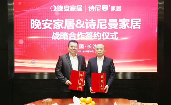 2021年末之际,诗尼曼家居董事长辛福民携一众高层参观走访晚安家居文化园。双方在文化理念与战略思想上高度同频,就联合研发、运营、营销、共同创新打造整家定制全案营运模式达成共识,签署了战略合作协议。