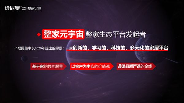 这一点,与诗尼曼一直以来的品牌布局初衷不谋而合,诗尼曼整家定制战略的启动,也是回归到以用户思维为驱动,重新定义家居行业的生活方式品牌。以品质严选为核心,通过全空间场景的一站式整体空间解决方案,满足消费者智能、潮流、格调、情感等多维度的居住需求,承接“年轻一代”内心渴望,就是诗尼曼所追求的整家定制终极之路。