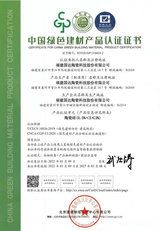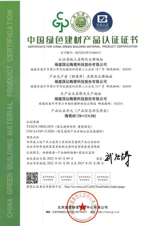 近日,国达陶瓷凭借优异的环保理念和绿色的生产环境,获得由北京国建联信认证中心颁发的“中国绿色建材产品认证证书”。