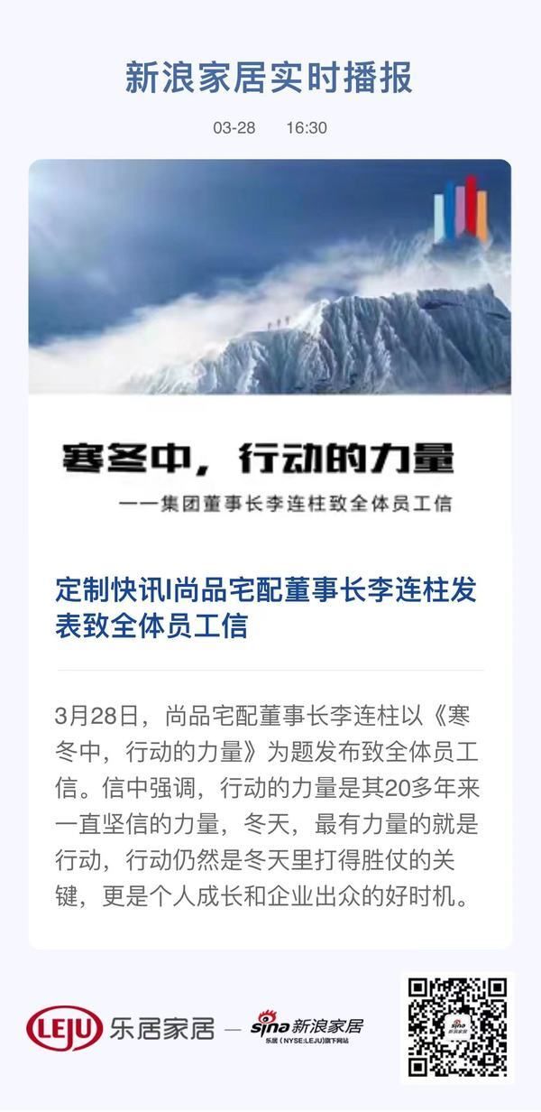 新浪定制频道讯 3月28日,尚品宅配董事长李连柱以《寒冬中,行动的力量》为题发布致全体员工信。信中强调,行动的力量是其20多年来一直坚信的力量,冬天,最有力量的就是行动,行动仍然是冬天里打得胜仗的关键,更是个人成长和企业出众的好时机。