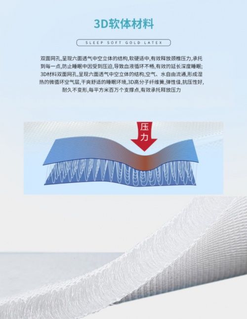 这款床垫的睡感软硬适中,支撑平稳,适合不同体型的人使用。床垫正面采用了3D材料填充,3D材料具有360°透气的中空立体结构,形成百万个独立有效支撑点,能够快速均匀分散人体重量,平衡床垫的整体支撑力,有效的延长深度睡眠时间。