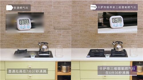 卡萨帝厨房在解决火力不旺的难题上有了新突破。卡萨帝「钢琴家」燃气灶运用了三维增氧技术,能达到5.1KW的大火力,实现蔬菜快速断生,有效锁住营养和水分;加上178个直喷火孔,使大火更猛,蒸煮煎炒的效率比普通灶具快25%。一则测评视频显示,同样将2L自来水烧至沸腾,普通灶具用时7分37秒,卡萨帝仅为6分36秒。在炒菜表现上,卡萨帝「钢琴家」燃气灶10秒即能完成一道爆炒西芹,15秒就能完成一道爆炒腰花,家里客人再多,也能在短时间端上一桌活色生香的菜肴。