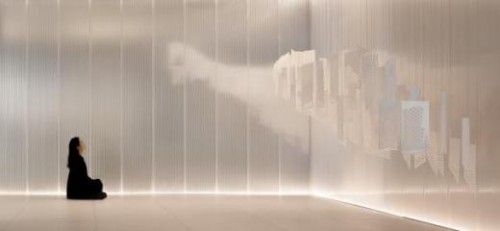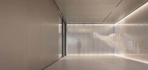 纯粹、素雅的哑光钢板与半透明的卡布隆材质复合在一起,阻隔了外界复杂的光影,也隐蔽了本可尽收眼底的展厅。通过部分的客观视界和全部的主观想象调和,空间形成递进的仪式感的同时,亦怂恿着人们的窥探欲望,形成了“窥”的复调。