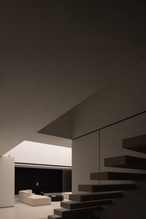 通往二楼的VIP洽谈室,通过悬空的线性步梯,像是连接不同宇宙空间的“虫洞”,人们惬意穿梭在不同空间,无论身处何处,都能感受CIVRO系统门窗“窥与隐”的设计语言。
