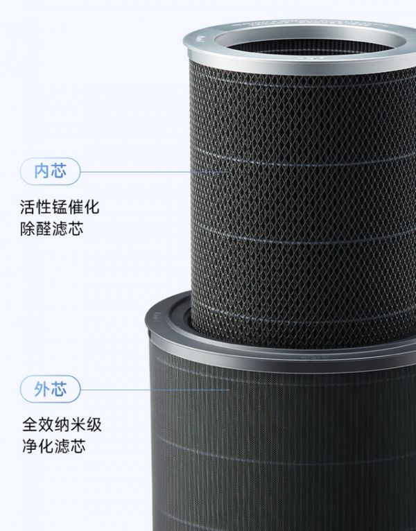 Jya峡湾Anti防过敏消毒空气净化器配备NanoGuard全效净化和Formaldehyde净醛组合滤芯,外芯NanoGuard全效净化滤芯采用纳米过滤技术,能高效滤除颗粒物,净化TVOC,深度拦截病毒细菌;内芯Formaldehyde净醛滤芯采用活性锰催化技术,可以将甲醛彻底分解为无害的水和二氧化碳,无二次污染,且自身无消耗,无需高频更换内芯。同时,采用分体式可拆卸设计,可以根据滤芯使用情况分别更换,相比一体式滤芯更长效更节约。