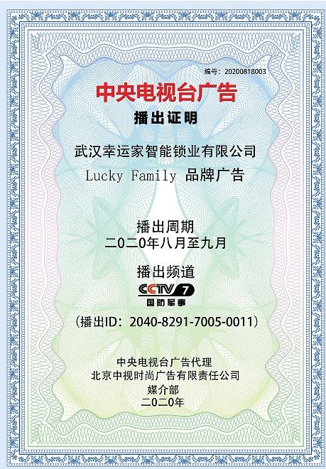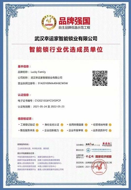 2021年5月,LuckyFamily(幸运家)智能锁被央视“品牌强国栏目组”选中,经过评审专家一个月对公司各项指标的考察、评比,最终获得“品牌强国工程智能锁行业优选示范品牌”殊荣;
