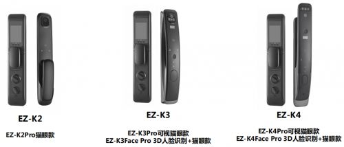 EZ-K系列的高阶款产品——K3与K4的FacePro3D人脸识别+猫眼款,主要增加了3D人脸开门的解锁方式,识别速度快、低功耗,有着业界公认的安全性和良好的用户体验。