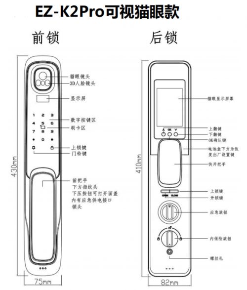 此外,EZ-K系列所有产品均自带140°高清广角摄像头 ,内置猫眼,3.5寸高清显示屏 180天超长续航。C级全铜锁芯应急开锁,后锁应急把手快开,电机旋钮手动快开。