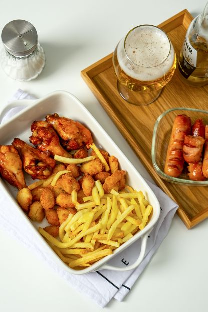 首先就是我最爱的炸物小食拼盘啦,以往在吃炸鸡的时候,总是不能尽兴,会很担心油炸食品的健康问题;另外高热量的油炸食品实在太容易长胖了,减脂期每吃一块都要精细计算卡路里,实在是一种折磨。