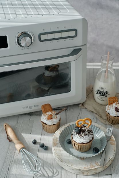 除了酥脆无油的健康炸物小食拼盘,东菱空气炸烤箱制作花式甜品也不在话下,就算是其貌不扬但对烘烤温度有严格要求的纸杯蛋糕,它也能轻松应对。只需要准备鸡蛋、细砂糖、玉米油、牛奶和低筋面粉,搅打均匀后将蛋糕糊入纸杯八分满,放入东菱空气炸烤箱,选择烘焙模式,160℃烤25分钟,就可以大口朵颐松软美味的纸杯蛋糕啦!