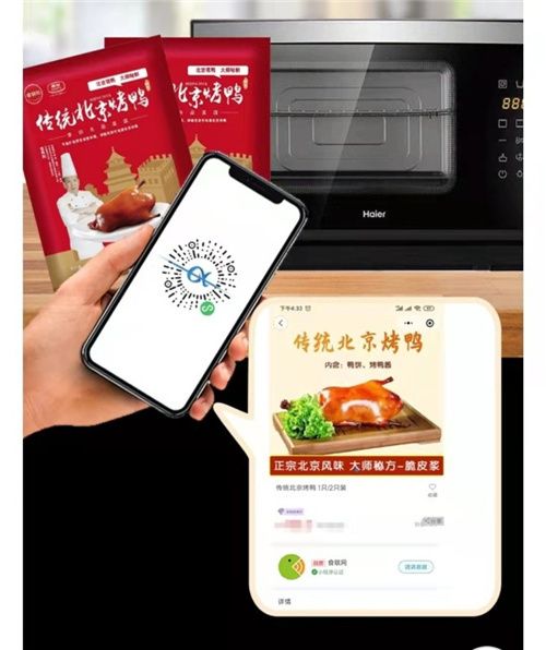 种类这么多,做起来都方便吗?北京烤鸭大家都知道,40道工序,在家做基本不可能,现在有阿尔法鱼平台,只要3步就能在家吃到正宗的。用户在小程序下单北京烤鸭,到货后只需拿出鸭胚放入蒸烤箱,“叮一下”扫描食材码启动烹饪,烤制完成后,还会主动提醒你享用烤鸭。这样一来,不用担心不会做、做不好,厨房小白也能享受下厨的快乐。