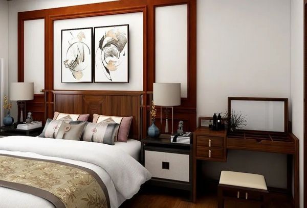 在生活时间相对较久的主卧,居住的舒适程度尤为重要,墙面并没有大面积的留白,主卧床头设计简约大气,在墙体上留出了悬挂装饰的空间,并搭配隐藏式储物,凸显空间感的基础之上增加储存空间。与整体装修风格协调的原木色家具搭配软装营造温馨舒适的氛围,满足业主的居住需求,整个氛围舒适且怡情。