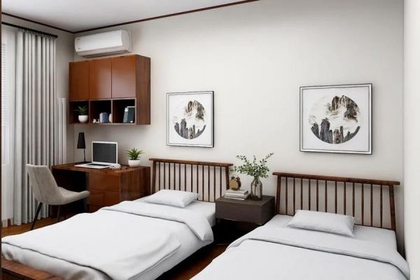对于两个次卧分别设计了老人房和儿童房,老人房中主要是以舒适简约作为主要的设计重点,考虑到老人年因因素,色彩搭配深浅有度,床的一侧放置书桌,别致而优雅,另一侧放置衣柜,方便日常换置,舒适感倍增。
