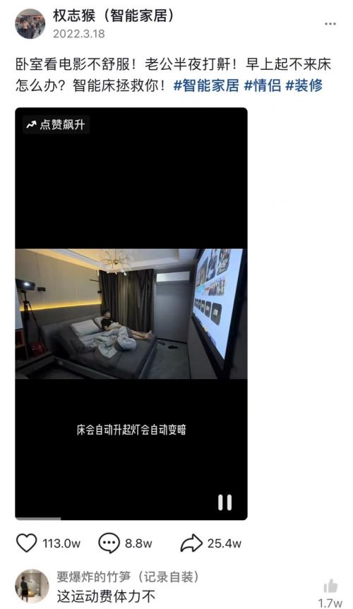近日一款来自趣睡科技的智能电动床红遍某短视频平台,发布几天时间点赞量已上百万,评论量也近十万。