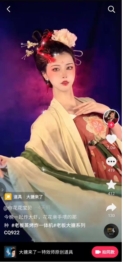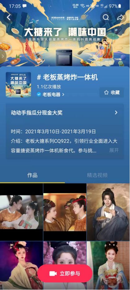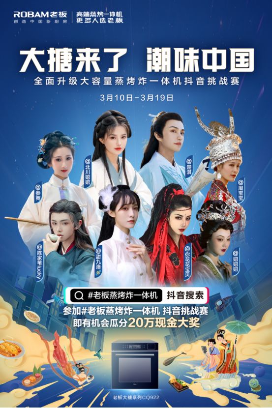 此次抖音挑战赛为什么选择唐风古装造型?首先,这款产品——老板蒸烤炸一体机的一大特点就是采用进口的星空蓝搪瓷内腔,对比常规款的不锈钢内腔,耐磨性、耐高温都更胜一筹,多次使用不易出现划痕,长久使用也不易变黄。而“搪”与“唐”谐音,结合这一概念,从年轻人钟爱的“谐音梗”出发,老板电器把这款产品称为“大搪”,而它的上市则称为“大搪来了”。