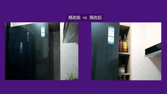 厨房微改增加了冰箱右侧的收纳橱柜,调整后冰箱与橱柜两侧零嵌,底部的前置散热搭配了隐藏式离心变轨铰链,实现顺畅抽拉开门,再也不用像普通冰箱那样,预留两侧卫生死角缝隙,收纳空间更是UP!