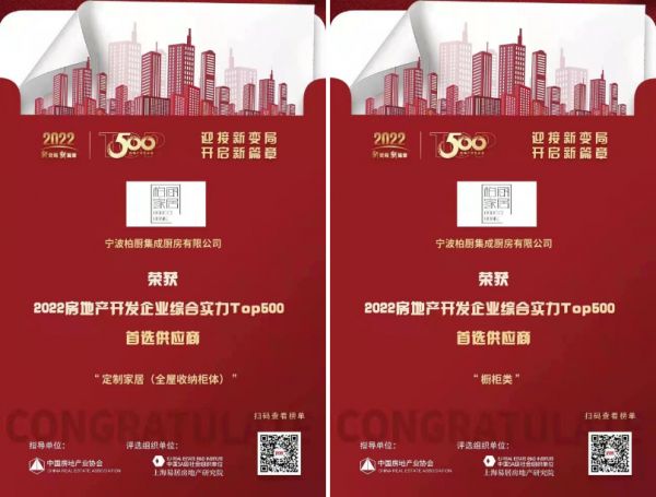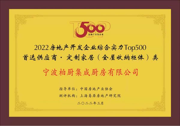 柏厨家居入选2022房地产开发企业综合实力Top500首选供应商-定制家居(全屋收纳柜体类...