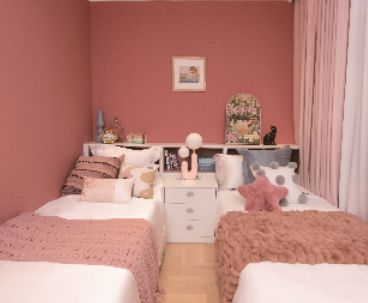 整个空间以美式风格为主,玄关主色调为墨绿色,过厅主色调为蓝色,大胆的用色为这个家铺垫了欢乐的氛围。客厅主色调为米黄色,温馨自在,家庭互动区以浅绿色为主色调,是孩子与宠物玩耍的场所。家庭互动区连通主卧和儿童房,主卧主色调为浅咖色,饱和度低有助于唾眠。儿童房主色调为粉色,更符合女孩们的审美取向,双人份的床和书桌,可以让两个女儿共同学习休息。