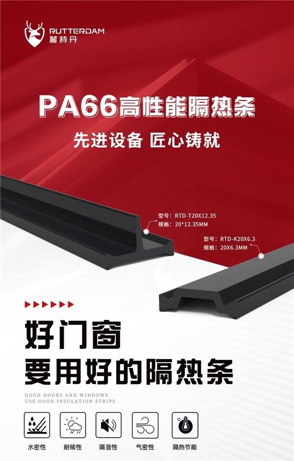 尤其根据门窗实用特性,原料经过改性处理,在兼顾韧性需求的基础上最大化提高隔热条刚性与机械强度,抗拉强度可达到 120MPa ,确保在负重时不变形、不下垂、不错位,紧密连接型材各个部件,有效提升整窗的安全性。麓特丹高性能隔热条选用最优质的环保 PA66 原料,无毒、无臭、抗霉、抗腐蚀,在使用环保几十年后仍可回收利用,符合欧盟 ROHS、REACH 环保指令。又根据尼龙特性经工程师改性处理,比未改性的PA66材料更好的隔断热量传递,达到更好的隔热保温节能降耗的效果。