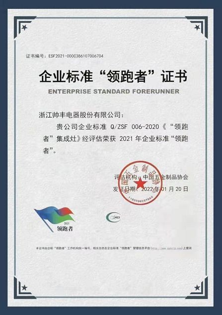 帅丰凭借企业标准Q/ZSF 006-2020《"领跑者"集成灶》荣获2021年企业标准"领跑者"证书,以多项行业标准制定者的身份,掌握行业话语权,推动行业高质量发展。