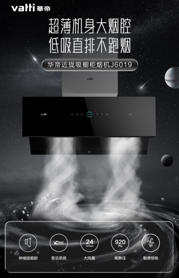 华帝魔尔烟灶套系包含近拢吸橱柜烟机J6019和鸳鸯灶BZ8352B,拢吸橱柜烟机J6019采用创新拢烟腔外推结构,日常关闭“隐”于橱柜,释放厨房空间;超薄机身设计,伸缩拢烟腔,顺势直吸更强劲,爆炒风量高达24m³/min,整体造型既动感又独具个性魅力;另外,J6019还配有手势智能控制和V-Clean智洁系统,挥手感应,瞬吸油烟,并且操作更便捷,好用好看好清洁。