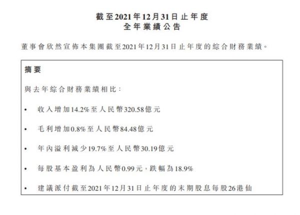网易家居讯:2022年3月28日,中国联塑(02128)发布2021年全年业绩公告。公告显示:2021年,中国联塑营业总收入按年增加14.2%至人民币320.58亿元;毛利按年微升0.8%至人民币84.48亿元,每股基本盈利为人民币0.99元,比上年同期下降18.9%。