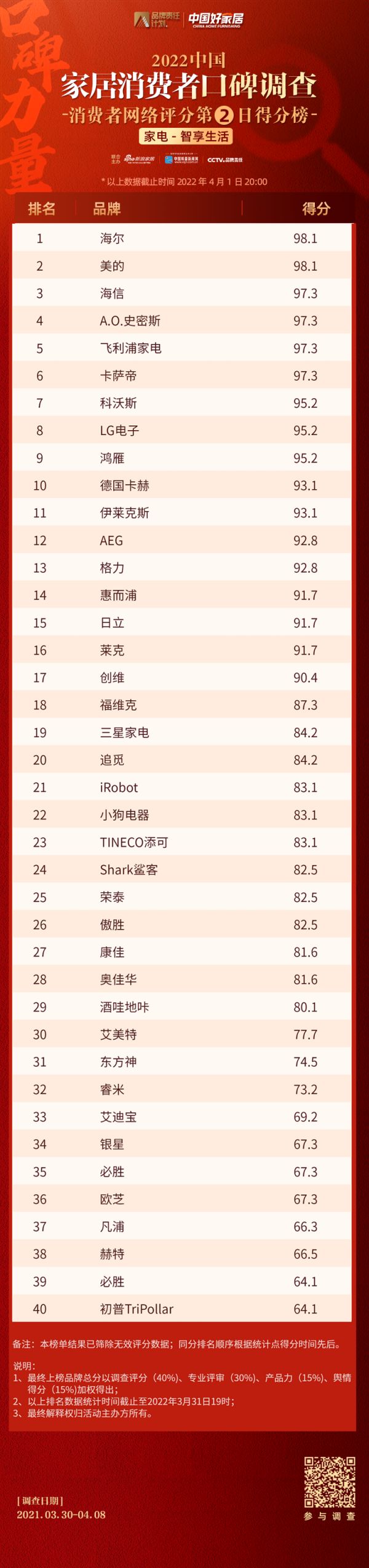 调查第二日,截至4月2日20时,在家电行业智享生活品类消费者口碑榜单中,海尔/美的以98.1分并列第一,海信/A.O.史密斯/飞利浦家电/卡萨帝则以97.3分紧随其后。>>点击查看品类得分榜单