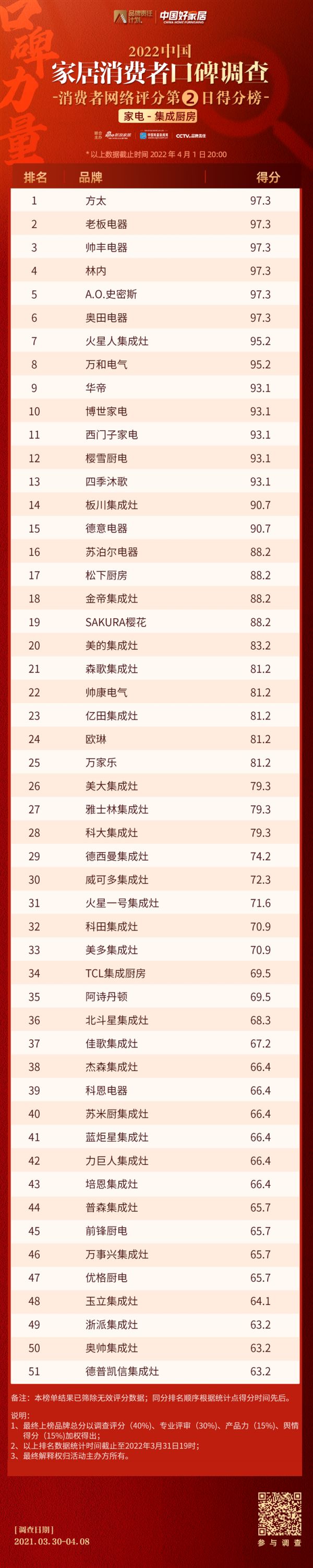 调查第二日,截至4月2日20时,在家电行业集成厨房品类消费者口碑榜单中,方太/老板/帅丰/林内/A.O.史密斯/奥田以97.3分并列前六第一,其他品牌紧随其后,评分咬的十分之紧。>>点击查看品类得分榜单