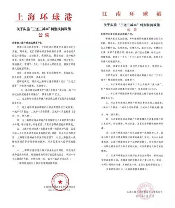 月星集团旗下两大旗舰城市综合体——上海环球港和常州江南环球港在3月24日发布公告,宣布出台扶持政策,对商户实行专项帮扶,包括购赠新冠肺炎专项保险,赠送线上线下媒体广告资源,减免商户半个月的租金、物管费、能耗费等费用,免费发放新鲜果蔬等多项具体措施。