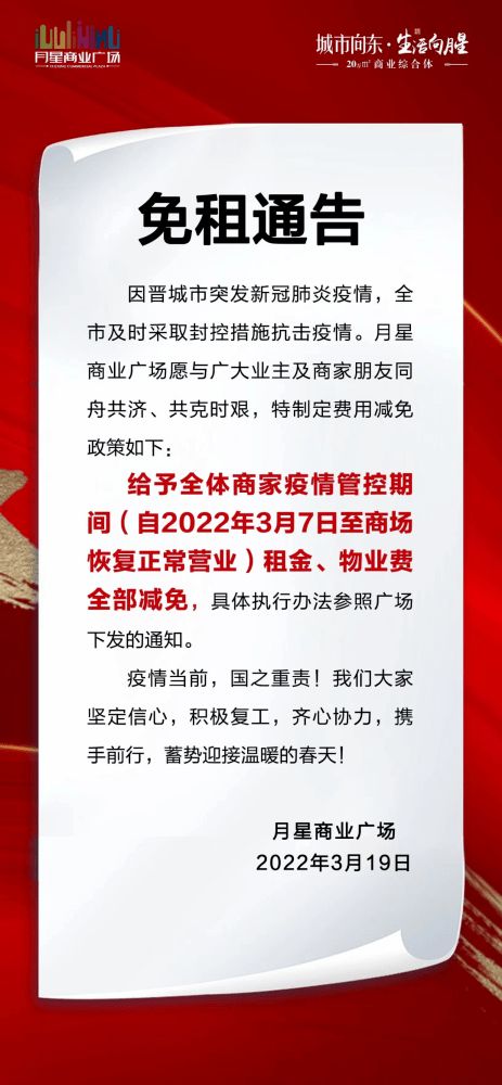 山西晋城红星美凯龙、月星商业广场等卖场也发出免租通告,称自2022年3月7日起,至商场恢复营业期间,商场租户的租金、物业全部减免。