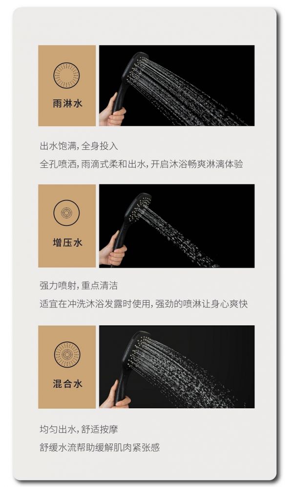 按键式快速切换3档出水模式,多层次spa体验,满足不同沐浴需求,放松每一寸肌肤。