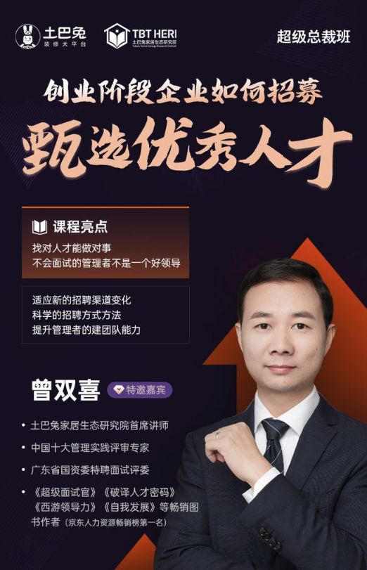金三银四之际,土巴兔家居生态研究院希望通过此次专题课程帮助装企管理团队了解专业招聘知识,梳理适合企业的招聘流程,高效找到适合企业的人才。此外,课程结束后,土巴兔家居生态研究院还会为大家提供专业的咨询服务,帮助大家解决实践中遇到的问题。