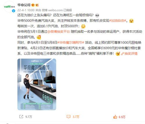 从操作层面来看,华帝#加油自由#活动的参与设计极为简单,只需关注华帝官方微博并转发该活动话题,即可实现参与活动;同时,网友亦不需要担心5000 升汽油“打折扣”,目前华帝#加油自由#微博活动的转发量已经突破9.7万次(4月6日实时数据),早已超过了5000 升汽油的封顶线。只要你参与,就有可能实打实的拿到5000升免费汽油,价值49500元。