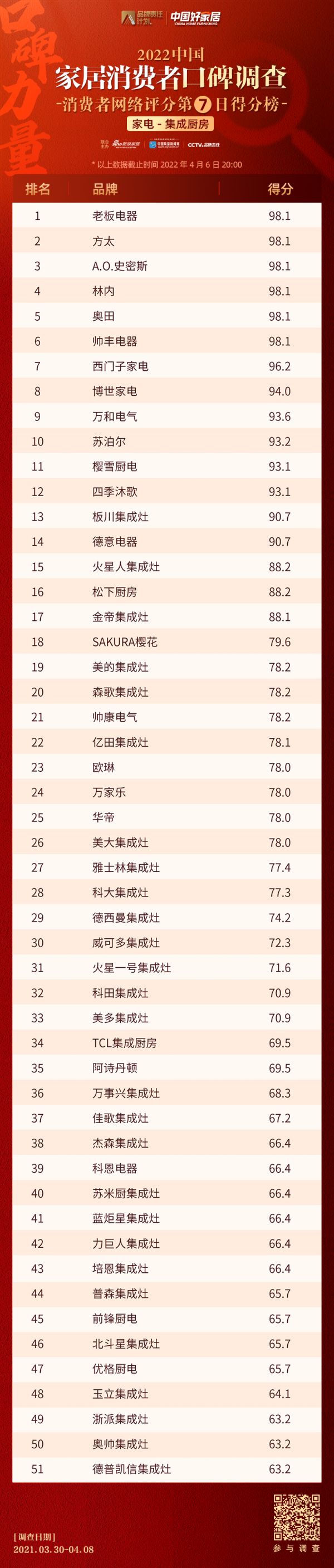 调查第七日,截至4月6日20时,在家电行业集成厨房品类消费者口碑榜单中,老板电器/方太/A.O.史密斯/林内/奥田/帅丰电器以98.1分并列第一。>>点击查看品类得分榜单