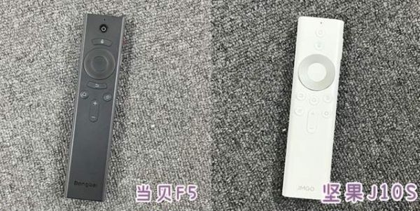 当贝F5的遥控器在前一代的基础上进行改进,魔法侧边键升级成了两个,红色侧边键长按能够自动对焦,短按手动对焦,不需要再找到设置一步步调焦,对焦更加方便;下面侧边键直接调出系统设置,对于新手小白上手极其方便。Home键长按可以调出后台运行程序并进行清理,短按直接返回主页;而坚果J10S遥控器就很常规,塑料质感严重。