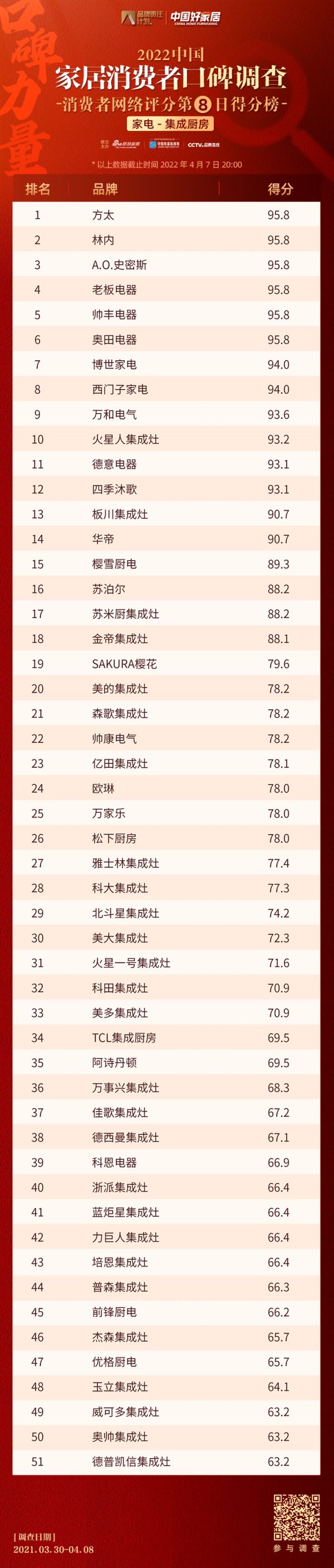 调查第八日,截至4月7日20时,在家电行业集成厨房品类消费者口碑榜单中,方太/林内/A.O.史密斯/老板电器/帅丰电器/奥田电器以95.8分并列第一。>>点击查看品类得分榜单