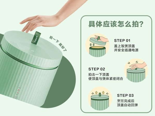 除颜值爆表外,TOKIT厨几拍拍煲最特别的地方就是它的启动方式——“拍一下就好了”。只需盖上饭煲顶盖,轻轻一拍,它就能进入烹煮状态。舍弃了传统的复杂按键或旋钮,“拍一下”,这种简单又好玩的操作十足给烹饪带来了更多新意和乐趣。