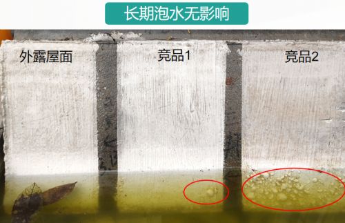 屋面防水裸露在外,也要考虑耐水性能,如果防水材料耐水性能达不到要求,就很容易产生鼓泡、泛白,影响防水效果。在长期浸水实验中,老顽固外露屋面防水完好如初,而竞品已经产生鼓泡现象,这也证明了老顽固外露屋面防水具有非常好的耐水性,雨季长时间浸泡也不怕,保障长久防水效果。