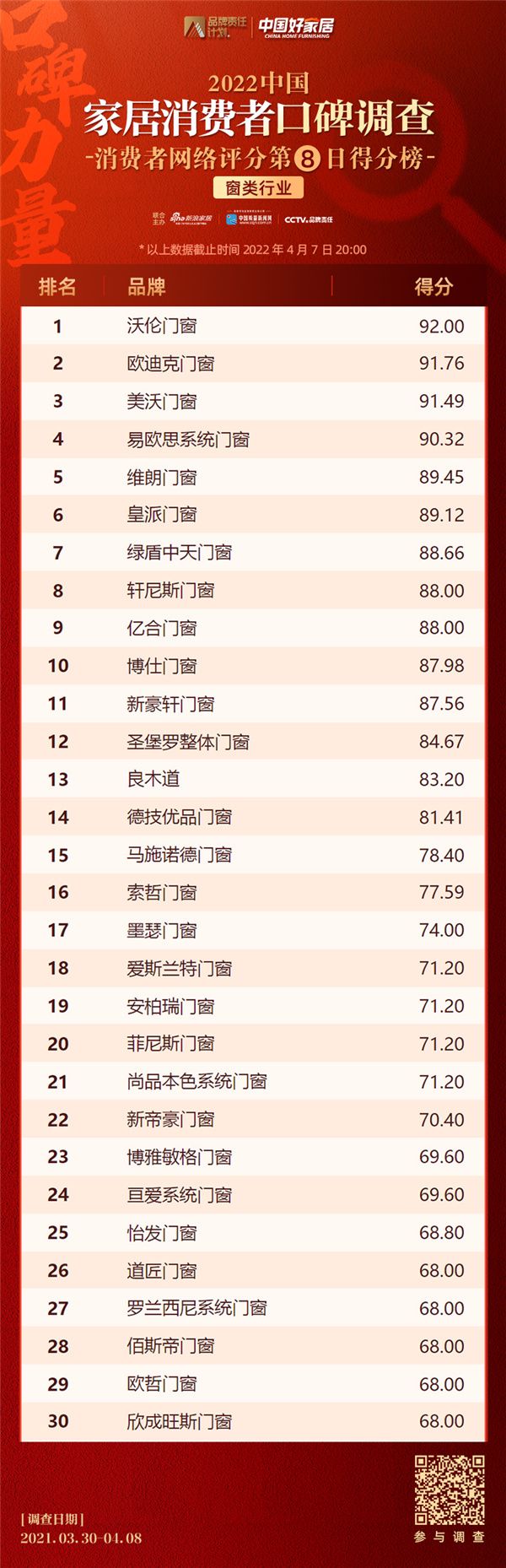 调查第七日,截至4月7日20时,在门类行业消费者口碑榜单中,3D无漆木门以90.40分名列第一,春天木门、欧派木门紧随其后。