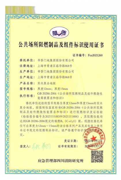 自2020年,书香门地集团联合中国林业科学研究院木材工业研究所、兄弟木业开展“多层实木复合地板阻燃技术及其应用示范”项目的技术开发和应用,开发阻燃涂层和阻燃木地板制备技术。在林科院木材所专家的指导下,经过两年多的研究与试验,书香门地多层实木复合阻燃地板成功上市。