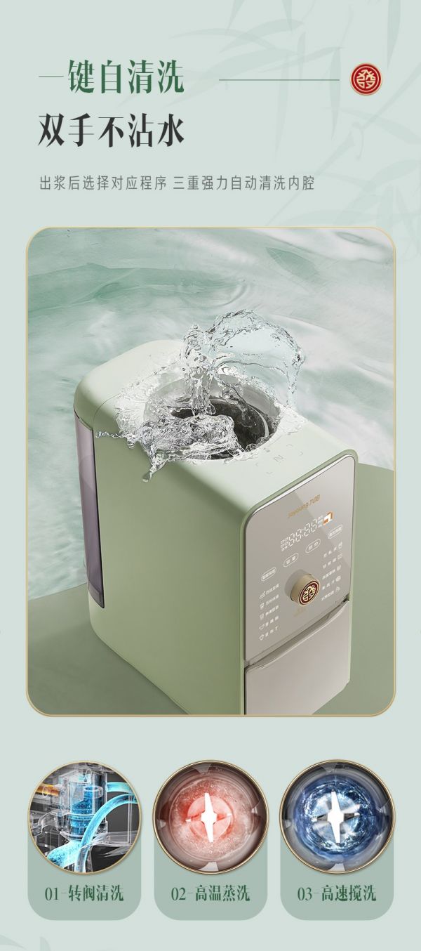 每当烹饪完成后,“豆福發”就会启动一键自清洗程序,通过转阀清洗-高温蒸洗 - 高速搅洗三重强力自清洗对内腔进行全方位清洁,不放过任何一处可能的食材残渣以及凝固的污渍,带来比手洗更洁净的清洁效果,还原内腔干净如新。