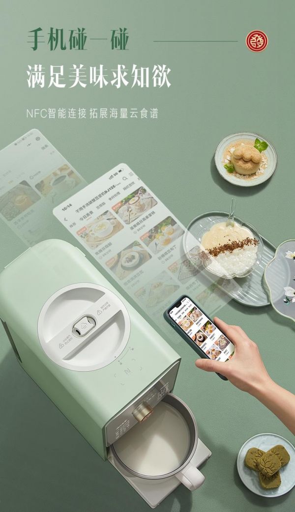 除了颜值过人,“豆福發”还支持NFC食谱拓展,只需手机碰一碰,即可实现手机与机器的连接,预约、智能操作、海量食谱随手可得,满足美味求知欲,下次朋友聚会,悄悄做出一桌子美味,然后惊艳所有人。