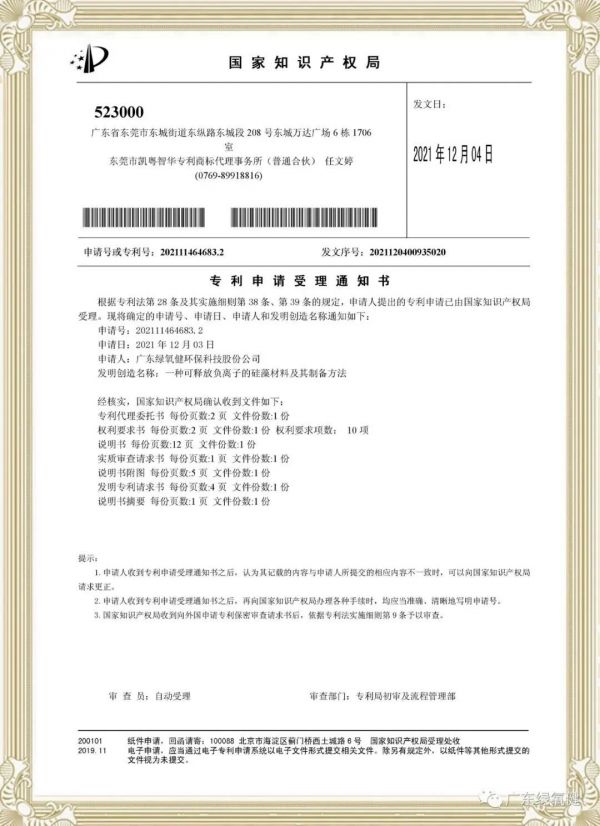 绿氧健专家团队攻关多年,研发出获得国家专利的负氧离子生发技术,并应用于绿氧健空气维生素。产品由纯天然海藻和环保纳米材料复合而成,富含活性基因。与空气接触,可以全天候持续性释放天然负氧离子。而且释放过程完全无害,不会产生臭氧、放射性物质等危害人体健康的衍生物。