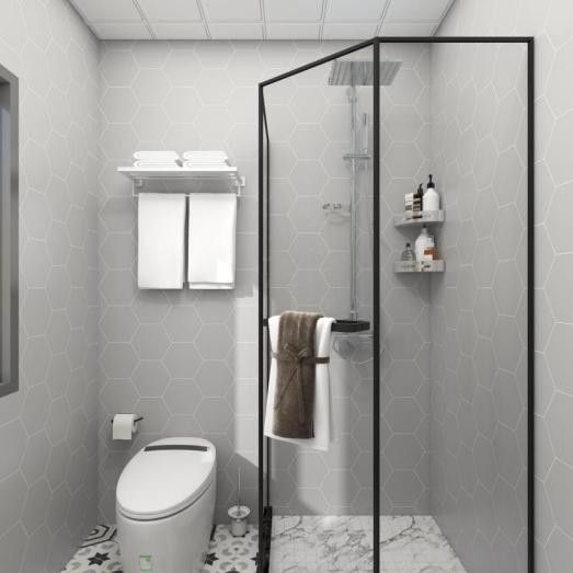 在淋浴区利用转角空间,根据位置大小,安装搁板或者摆放收纳架,填补角落的空白,把洗发水、沐浴露等瓶瓶罐罐整齐摆放,使用更便利。