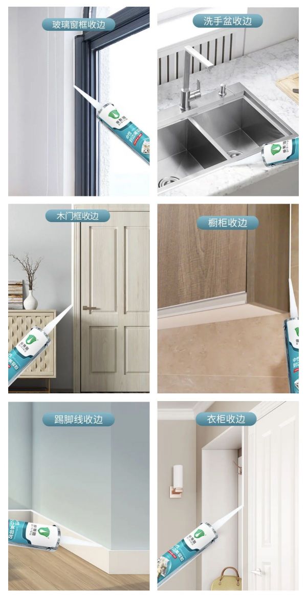 广泛用于门、窗、集成墙面、护墙板、背景板、吸音板、踢脚线、装饰线条、橱柜、台面等的粘接或填缝密封。