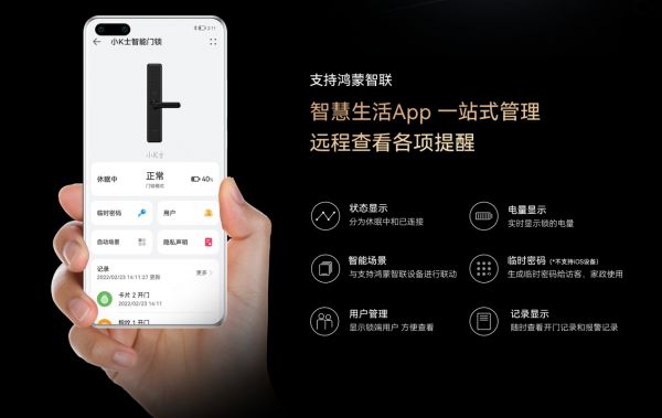 支持鸿蒙智联的小K士还能与华为、荣耀手机连接,添加门卡就能实现手机一碰解锁,即使是在手机关机和熄屏的情况下也能照常解锁。