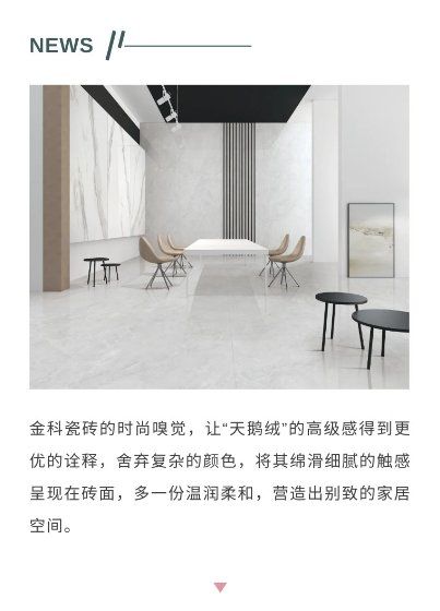 每个行业都有独特的潮流指引,而家居建材圈也不例外。金科瓷砖将拥有温润光泽和质感的天鹅绒复刻在瓷砖上,它自带的华丽及出众的光触感,一直备受建材圈产品设计师的青睐,复古潮流百变,也很时尚前卫。