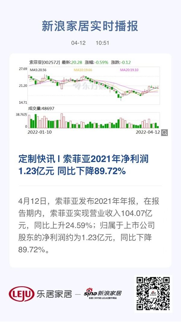 定制快讯 | 索菲亚2021年净利润1.23亿元 同比下降89.72%