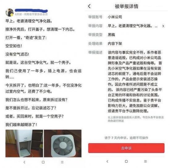 河南省郑州市的李先生发现家里的小米空气净化器无芯空转了一年多,却怎么也想不起来滤芯是何时丢失的,便在今日头条其个人的微头条上发布了这件事。没想到,小米通讯技术有限公司(以下简称小米公司)随即投诉了李先生,称其发布的微头条是“恶意造谣诋毁”的“黑稿”,还坚称“小米空气净化器如果在没有安装滤芯的前提下,通电后是不会运转工作的”。深感人格遭受侮辱的李先生投诉至河南省消费者协会,和消协工作人员一起见证了“小米空气净化器无芯空转”的事实后,要求小米公司撤回“黑稿”投诉并公开赔礼道歉,还自己人格尊严。