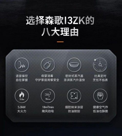 森歌i3蒸烤消一体集成灶主打母婴消毒健康概念,采用高温蒸汽动态消杀,快速杀灭顽固细菌,守护家人健康。特有的蒸汽增强装置,可通过特质喷射式蒸汽孔,配合包覆式加热膜,升温无需缓冲,澎湃蒸汽升温快,尽最大可能地保留食物的营养和美味。再加上漏电保护、熄火保护、智能巡检、三防电机、原始复位、电子防火墙、过热保护以及安全童锁等八大防护体系,严守厨房安全,让您拥有更安心、舒适的烹饪体验。